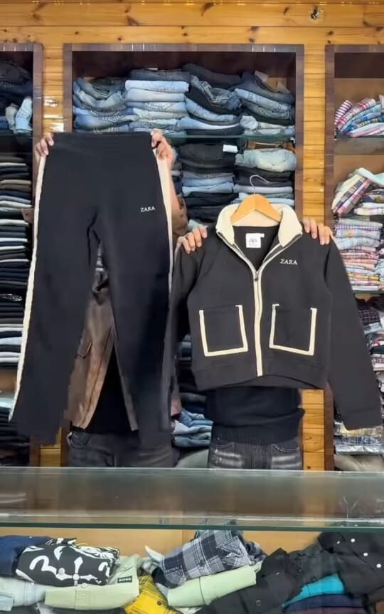 The image shows a person in a clothing store holding up a brown tracksuit set. The set includes a brown zip-up jacket with white piping details and matching brown pants. Below, another matching outfit is laid out on the counter. The background shelves are filled with folded jeans and other clothing items, indicating a retail apparel shop.