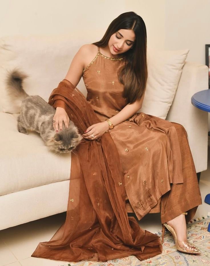 This elegant copper brown kurta set is crafted from a luxurious silk-blend fabric, featuring delicate gold zari embroidery and subtle beaded details along the neckline. The straight-cut kurta is paired with wide palazzo pants for ease and grace. The ensemble is completed with a sheer matching dupatta that flows beautifully, adding a light and festive touch. Perfect for intimate gatherings, festive celebrations, or evening wear, this outfit blends classic charm with modern sophistication. Gold heels and statement jewelry complete the look effortlessly.