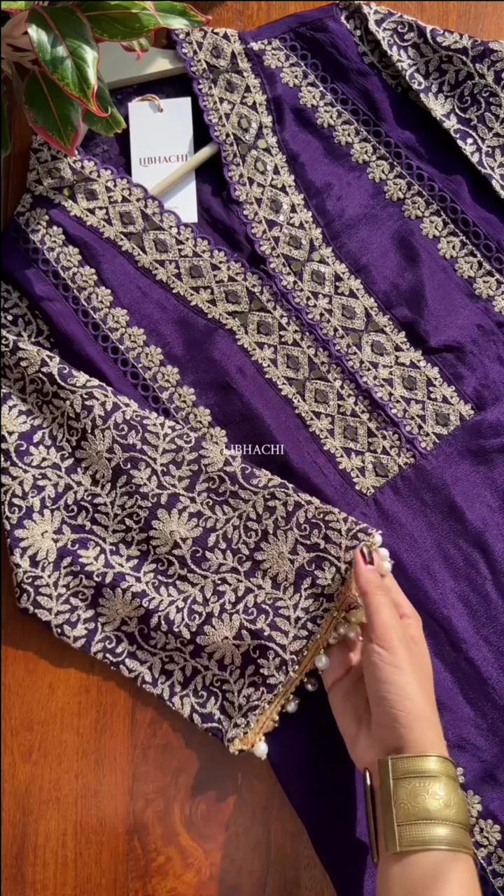 Dark Purple Chinon Heavy embroidered & Pearl Work