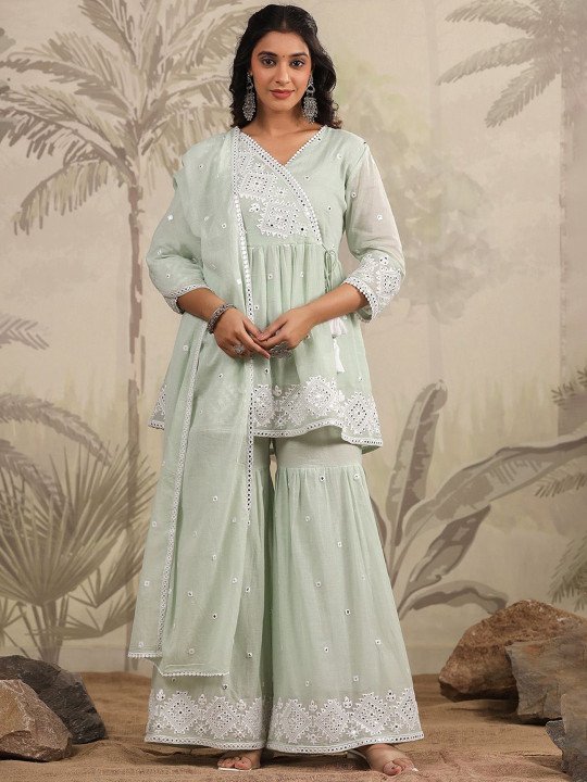 This embroidered pure cotton kurta with sharara set is a versatile addition to your wardrobe. It is perfect for: