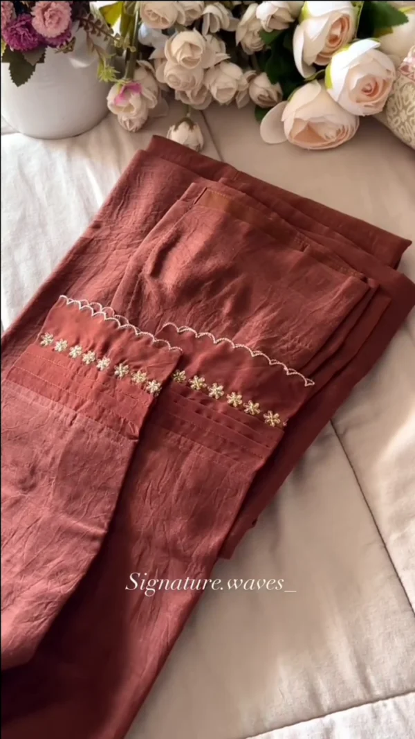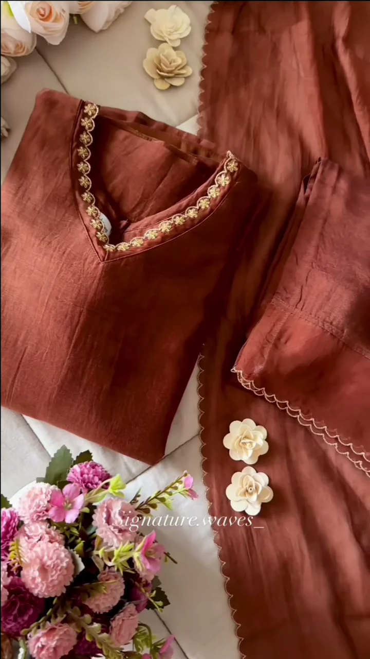 A rich brown Chanderi suit set that speaks of understated elegance.The top is adorned with intricate golden handwork on the neckline and sleeves, while the pure Chanderi dupatta, finished with delicate handwork scallops, completes the look with effortless charm.