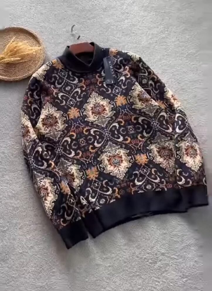 A warm, long-sleeve sweater with an intricate vintage-inspired pattern in earthy tones. The design features detailed motifs across the fabric, with ribbed cuffs, hem, and neckline for a snug fit. The sweater is laid flat on a soft surface, giving it a cozy and stylish autumn or winter vibe.